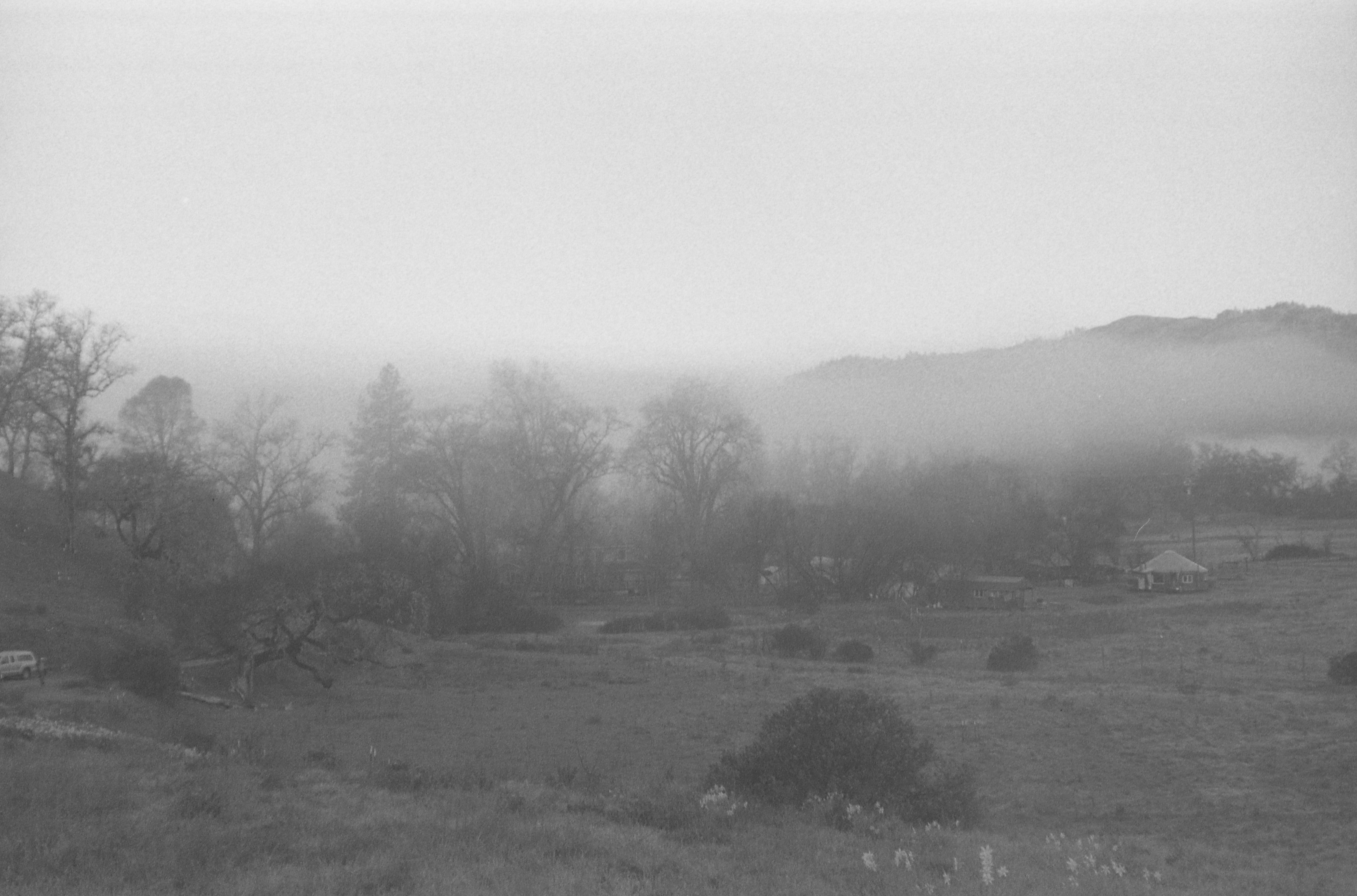 the land itself — fog settling into valleys, bare trees against winter hills,